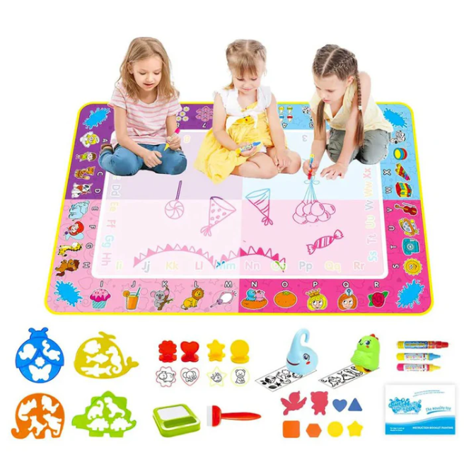 Deja que tus pequeños artistas den rienda suelta a su creatividad con nuestros bolígrafos mágicos llenos de agua. Las marcas desaparecerán como por arte de magia después de unos minutos ¡y sin dejar rastro!Incluye: 1 tapete para garabatos, 4 bolígrafos mágicos rellenables con agua, 1 folleto de diseño y 4 moldes de dibujoPortabilidad: Plegable y compactoDimensiones: 40 x 28 pulgadasMateriales: No tóxicosGARANTIA POR DEFECTO DE FABRICA.